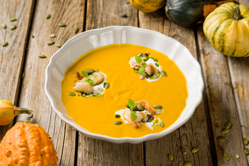 Pour soup into a deep plate, top with shrimp, sprinkle with pumpkin seeds, and add stracciatella.