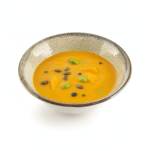 Garnish with diced roasted pumpkin, seeds, and edamame beans when serving.