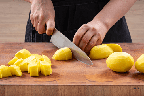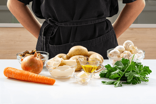 Clean and chop the potatoes, add them to a pot with mushroom broth, and cook for another 10 minutes or until the potatoes are done.