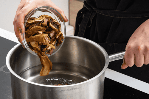 Pour water into a pot and add dried mushrooms. Bring to a boil and simmer for 10 minutes on low heat.