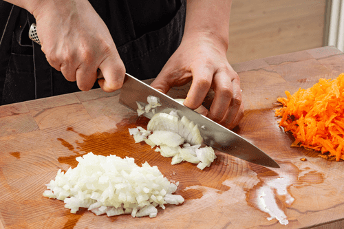 Chop the onion into small cubes. Grate the carrot on a coarse grater.
