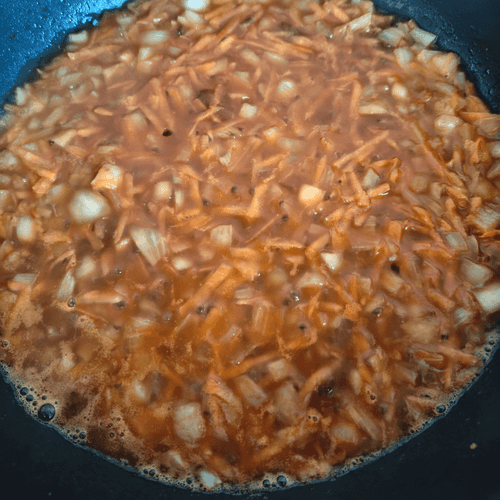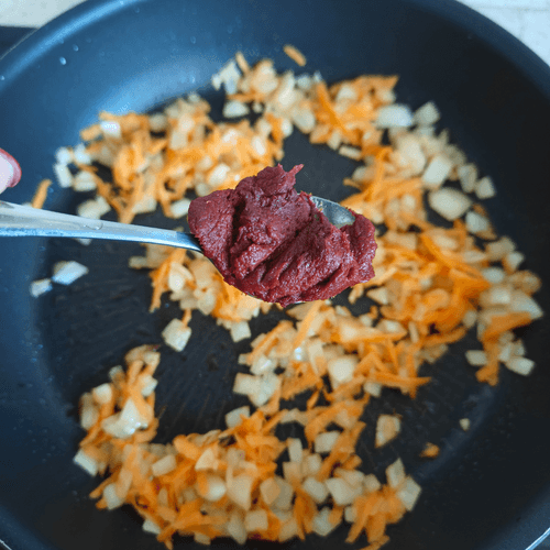 In a well-heated, oiled pan, add onion and carrot and fry until golden. Add tomato paste.