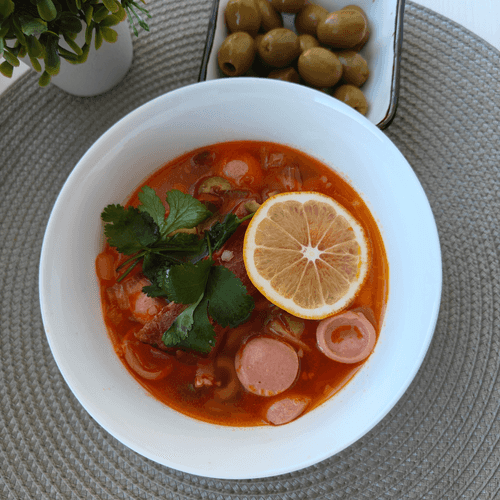 Meat solyanka is a thick, aromatic soup that is a true culinary symbol of Russian cuisine. Its history dates back to ancient times when travelers and innkeepers mixed various meat products to create a hearty and rich dish. Solyanka combines the spicy flavors of smoked meats, the tenderness of boiled meat, and the freshness of vegetables. Pickles add a characteristic sourness while olives provide exquisite notes. Lemon harmonizes the taste by creating a subtle balance between salty and sour. This solyanka is perfect for a cozy home lunch or celebration, awakening the appetite with its rich aroma. It is served with bread, sour cream, and herbs to enhance the depth of flavor. Each spoonful is a harmony of meaty and vegetable tones that leaves a pleasant aftertaste and a desire to try more.