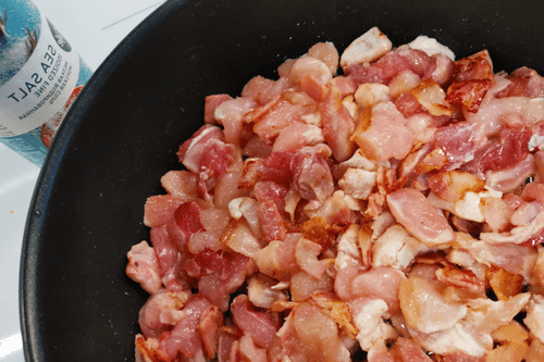 Add chicken fillet to the bacon. Mix.