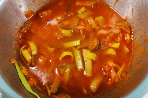 Add brine and tomato paste, mix thoroughly and cook for 5-7 minutes.