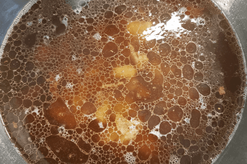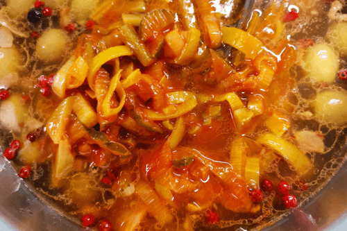 Heat the broth to a high temperature.