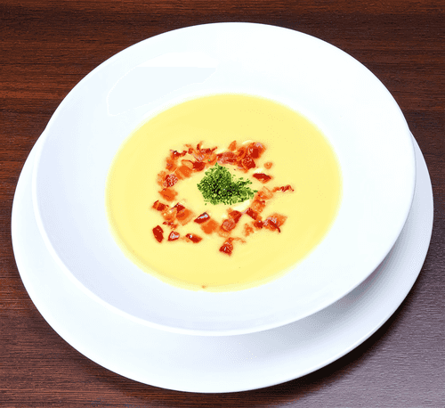 Before serving, place the fried bacon on the plates. Garnish the soup with chopped onion or crushed red pepper. Serve with hot baguette.