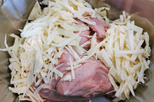 Place the cabbage next to the chicken.