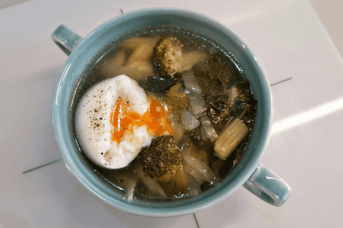 Pour the soup into a deep bowl, add boiled egg to taste, and serve.