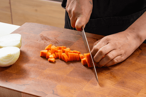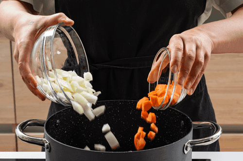 Heat vegetable oil in a pot and sauté the onion and carrot until golden.