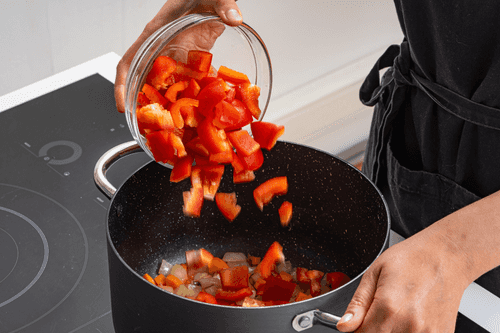Add pepper, fry while stirring for 10 minutes until the pepper is soft.