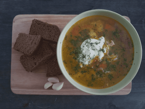 Turn off the heat and let the soup sit on the stove with the lid closed for 15-20 minutes. Serve the rassolnik with sour cream and finely chopped herbs.