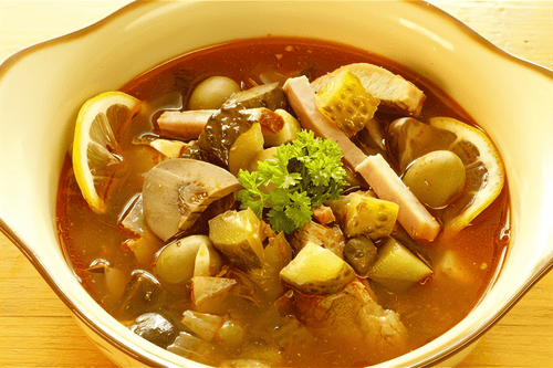 Solyanka is a bright and rich dish of Russian cuisine that embodies the traditions of hearty meat soups. Historically, solyanka originated as a dish for restoring strength, rich in protein and seasoned with spices for deep flavor. It combines the spiciness of pickles, the tenderness of offal, and the richness of broth, making it both filling and balanced. The sharpness of capers and the freshness of lemon add a pleasant tang to the dish, while sour cream softens the taste, creating a harmony of flavors. Solyanka is perfect for both a refreshing lunch and a Sunday feast. Served hot with herbs and olives, its aroma invites you to enjoy its deep flavor.