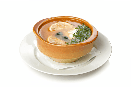 Before serving, place a slice of lemon and pitted olives in each plate, pour the soup, and sprinkle with chopped herbs on top.