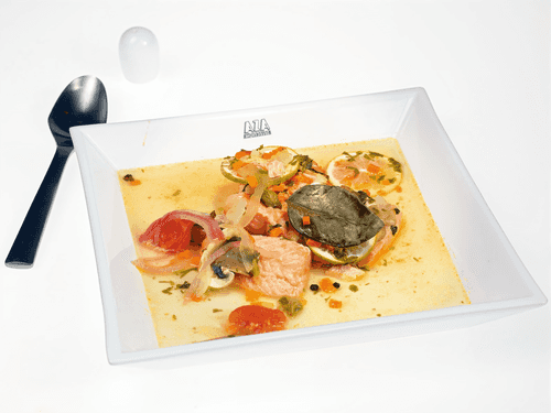 Salmon uha is an exquisite version of traditional Russian soup filled with refined aromas of white wine and vegetables. Historically, uha has always held a special place in Russian cuisine as a symbol of warm home comfort. This recipe features the tenderness of salmon fillet soaked in the light sourness of cabbage brine and notes of aromatic wine. The addition of capers, garlic, and celery gives the soup a piquant flavor, while mushrooms and parsley enrich it with freshness. Sweet paprika and black pepper finish the dish with pleasant spiciness, while thin slices of lemon add a refreshing tartness to the composition. Uha is served hot, warming the body and comforting the soul, making it perfect for a leisurely lunch or dinner, especially in cooler weather.