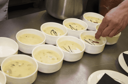 Add cream and grated nutmeg, season to taste. Using a hand blender, whip until frothy. Pour into cappuccino cups. Place sliced ciabatta on a saucer.