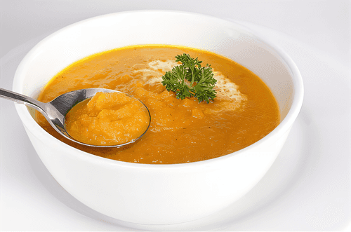 Pour in hot broth, bring to a boil. Increase the heat and quickly boil for 5 minutes until the carrot is soft. Add finely chopped coriander leaves. Blend in a blender. Add spices to taste.