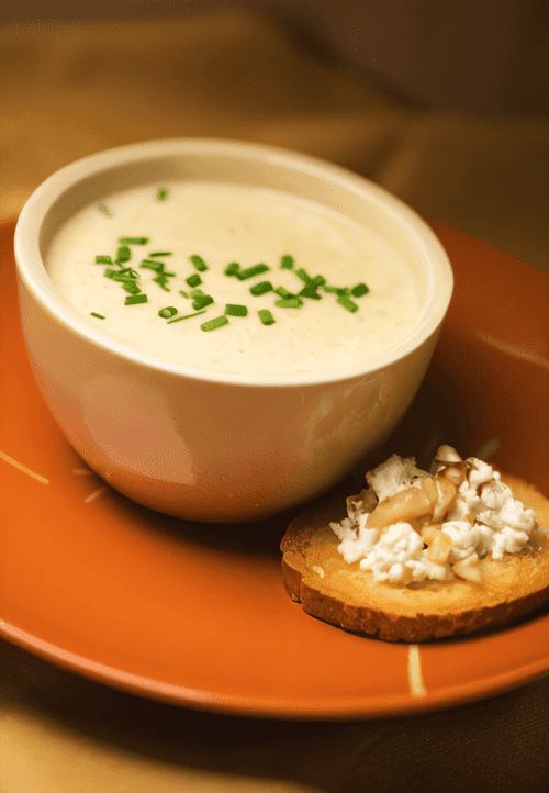 Broccoli soup with brie crostini is a gastronomic embodiment of tenderness and refined taste. This recipe comes from Sweden, where simplicity and naturalness are valued. The creamy soup with the aroma of fresh onion and broccoli unfolds with soft creamy notes, while the crostini with brie add a crunchy texture and a noble, slightly nutty flavor. The balanced combination of vegetables and cheese makes the dish nutritious yet light. Ideal for a cozy dinner or lunch on a cool day when you want to warm up and enjoy exquisite flavors. The presentation is complemented by fresh parsley, which adds a touch of freshness. Each spoonful is a harmony of flavors that warms the body and soul.