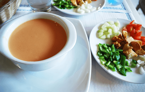 Chop the remaining tomatoes and cucumber, blend them, and then add to the soup.