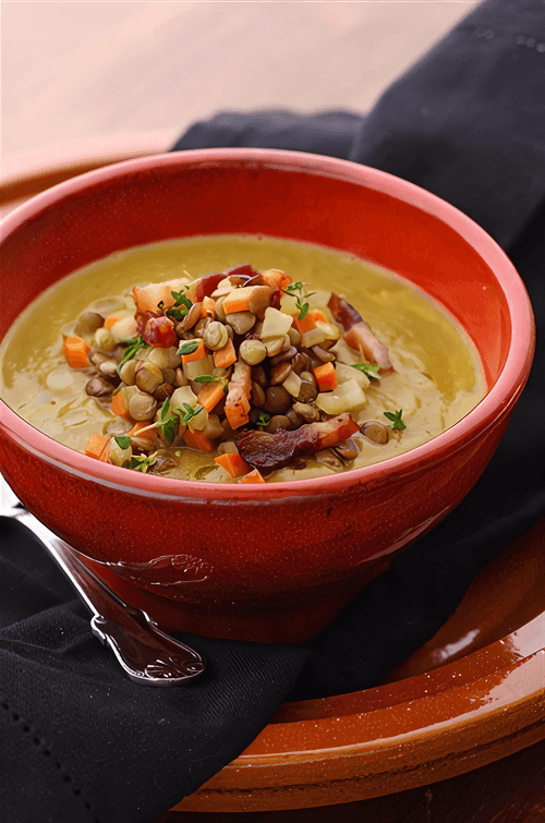 Lentil and bacon soup is a cozy and hearty dish from German cuisine that combines the deep flavor of smoked bacon, the softness of lentils, and the creaminess of cream. Historically, lentil soups were popular in Central Europe, where nutritious and simple ingredients were valued. In Germany, such soups were often made in winter to warm up on cold days. This version stands out for its richness: sautéed onions and bacon give it a caramelized aroma, while garlic adds a spicy note. It is served hot, often with crispy bread that perfectly complements the soup's texture. It is suitable for family lunches as well as cozy evenings when you crave something homemade and hearty.