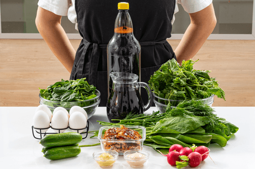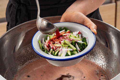 Arrange the vegetables and greens on plates and pour them with a mixture of kvass and beet juice.