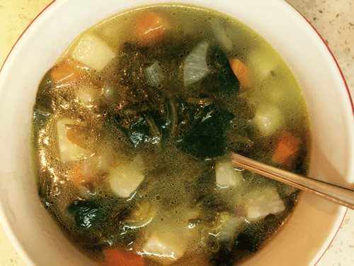 Pour hot water over the sautéed roots and boil for 5-7 minutes. Then add the washed and chopped sorrel and spinach, and boil for another 5-6 minutes.