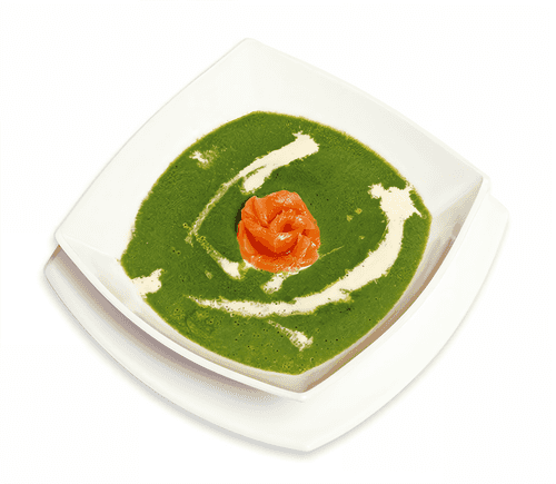 Spinach puree soup with Norwegian salmon is a true embodiment of northern cuisine's sophistication. The delicate creamy soup, enriched with fresh spinach, gains a special depth of flavor from the juicy Norwegian salmon that has undergone gentle cooking. A light tang of lemon highlights the fish's natural sweetness, while butter gives the soup a silky texture. Leeks and potatoes harmoniously soften the brightness of the spinach, creating a balanced and rich taste. Traditionally, such soups are prepared in Norway as warming dishes on cold days, served with soft pieces of salmon and half an egg. This dish is not only nutritious but also aesthetically refined, making it perfect for dinner in a cozy atmosphere.