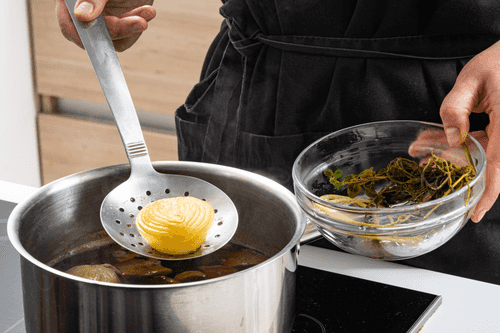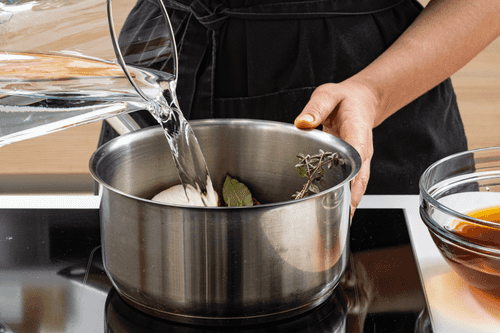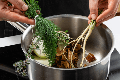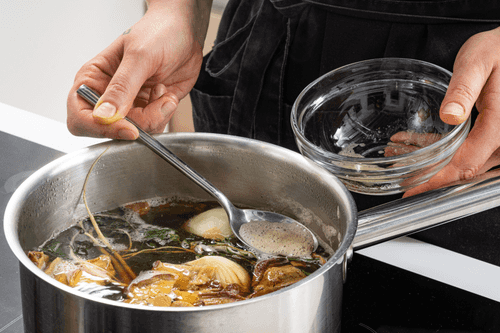 Bring to a boil, skim off the foam, and simmer the broth for about half an hour.