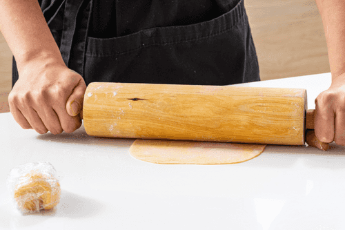 Meanwhile, prepare the noodles: knead the dough from flour, yolk, and a pinch of salt. If it's too dry, add a little water. Roll into a tight ball, cover, and let it rest for 20 minutes.