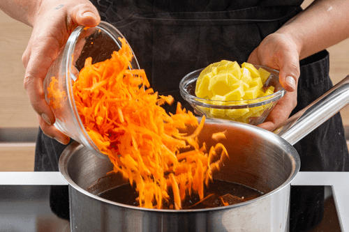 Add the julienned carrots and diced potatoes.