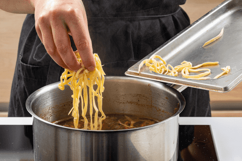 Divide the ball in half, roll the halves into balls. Roll one of the balls on a floured surface into a sheet 2-3 mm thick. Cut the sheet into noodle strips 5 mm thick.