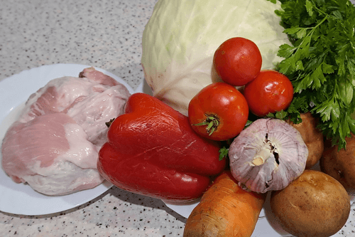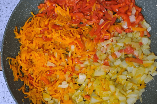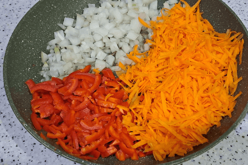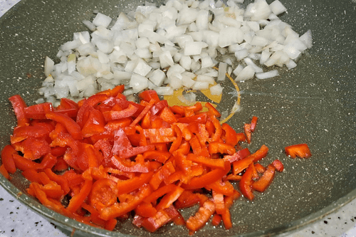 Wash the red sweet pepper well, remove the seeds and stems, cut into small cubes or strips, and place in the pan with the onion.