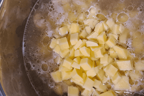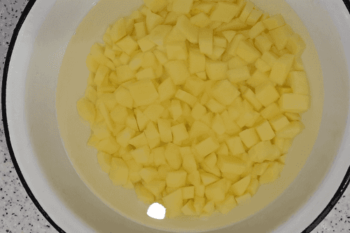 Cut the potatoes into small cubes, pour water over them, and set aside.