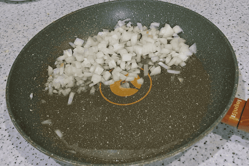 Pour 75 ml of vegetable oil into the pan. Finely chop the peeled onion and add it to the pan.
