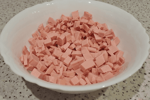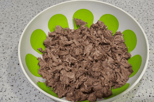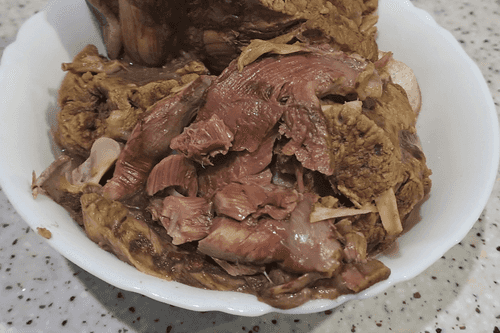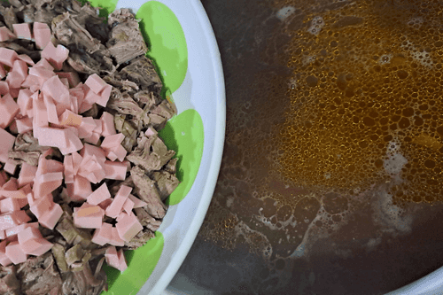 Separate the boiled beef from the bone, cut it into small cubes, and place it in a separate container.