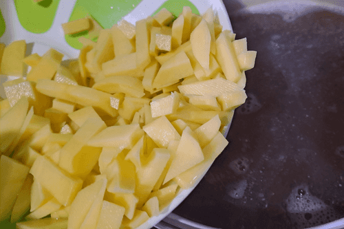 Peel the potatoes, cut them into cubes or strips, place them in a pot with broth, and salt to taste.