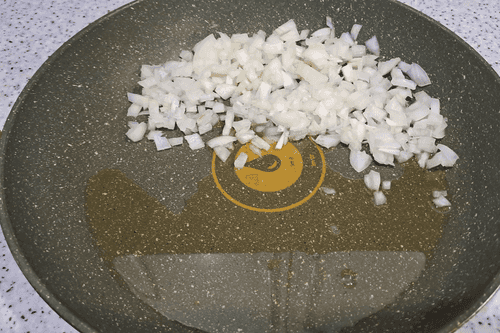 Peel the onion, wash it well, chop it into small cubes, place it in a pan, and add 100 ml of vegetable oil.