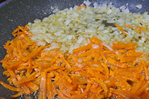 Peel the carrot, wash it well, cut it into strips, and place it in the pan with the onion.