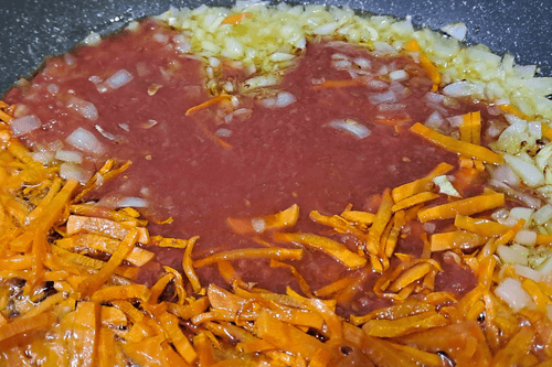 Pour 500 ml of thick tomato juice into the pan with the prepared onions and carrots, and simmer a little, stirring occasionally.