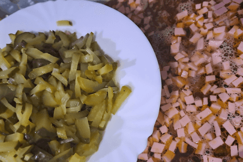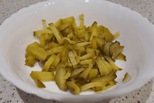 Cut the pickles into strips or small cubes and place them in a separate container.