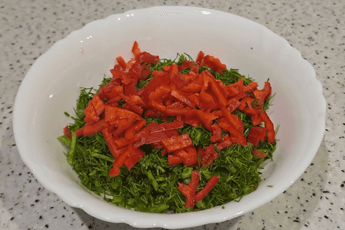 Wash the sweet pepper well under running water, remove the seeds, cut into strips, and place in a container with dill.
