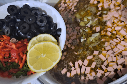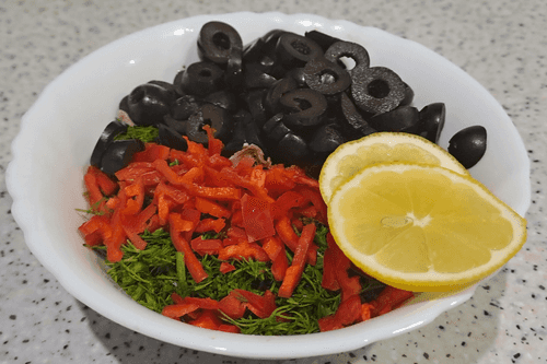 Slice the pitted olives into rings or strips and place them in a container with dill and sweet pepper. Cut the lemon into rings.