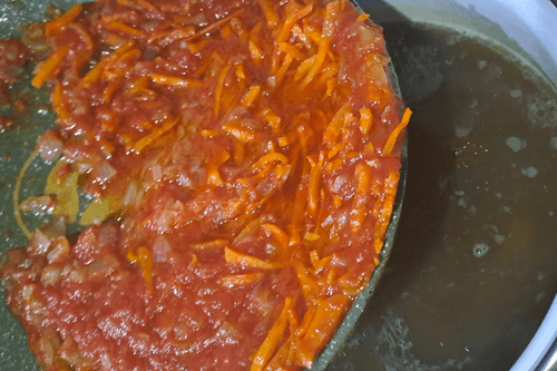 Add sautéed onions and carrots with tomato juice to the broth with cooked potatoes.