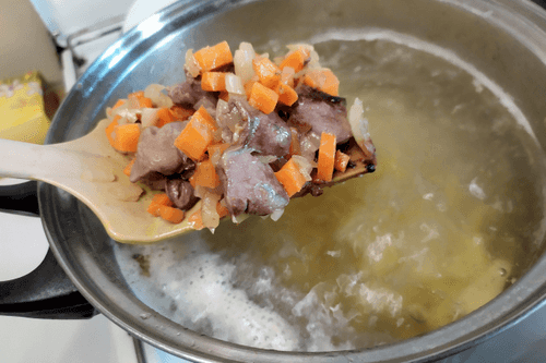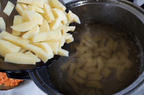 Boil the sliced potatoes in meat broth.