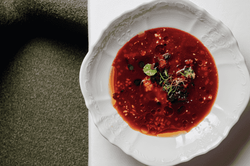 Arrange five cabbage rolls in a circle in the center of the soup plate. In the center of the resulting circle, alternately place carrots and bell peppers. Serve with borscht poured over.