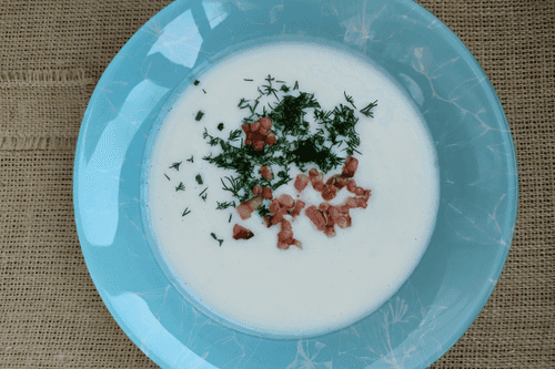 Serve the soup with added fried bacon and finely chopped dill.