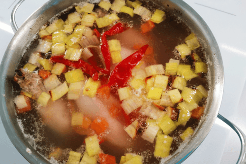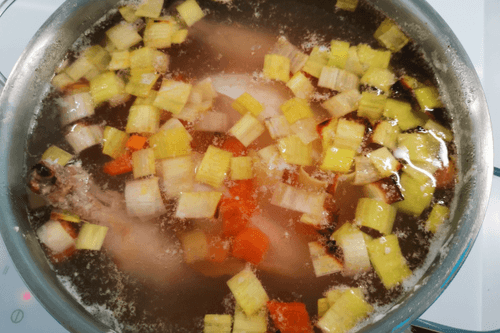 Once the broth boils, skim off the foam and reduce the heat to just below medium.