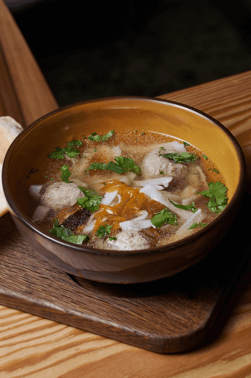 When we remember our childhood, we often think of home-cooked dinners, the recipes of which are passed down from generation to generation. This soup is exactly like that, and it seems to me that chicken soup gives any person, regardless of where they were born, a feeling of warmth and security, with it they feel at home everywhere. This recipe did not even have to be adapted to the restaurant format: rich broth, noodles, chicken meatballs - what could be better ? Perhaps a pinch of khmeli-suneli, which gives the soup a Georgian character. It is very convenient to cook a lot of broth at once, make the meatballs separately, and then simply combine them on the stove - this way, preparing a real homemade soup will take half an hour at most. Khatuna Kolbaya, co-owner of Saperavi Café and "Vai Me!" shared the recipe with us.