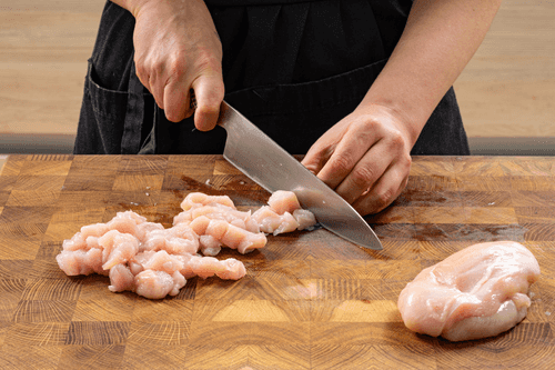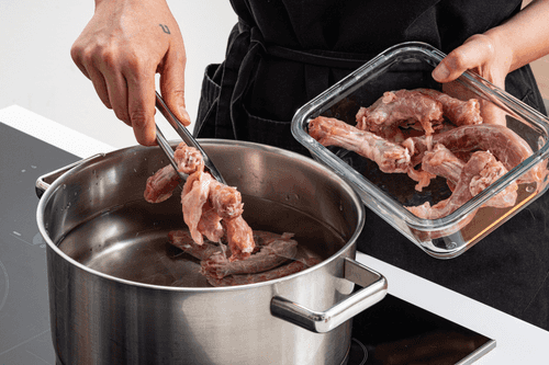 Submerge chicken necks in cold water, bring to a boil, reduce heat, and skim off the foam.