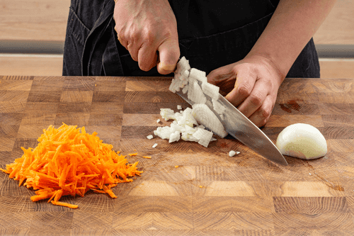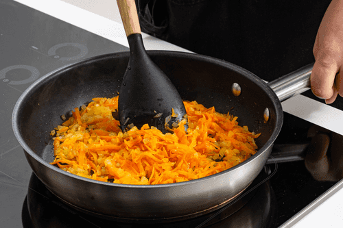 Heat vegetable oil in a pan and sauté the onion and carrot until soft.